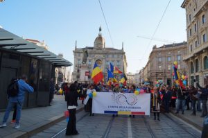 2. Mai mult de o sută de români au purtat prin centrul orașului Milano un steag imens și au cântat „Acolo este țara mea” FOTO