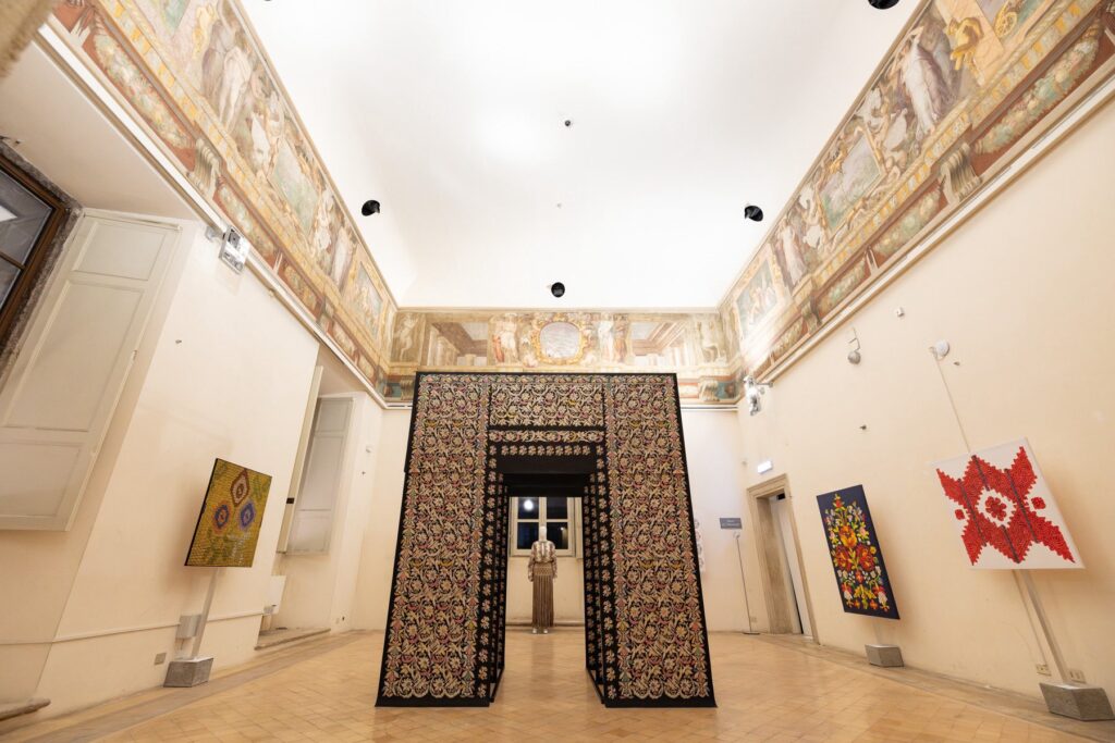 Expoziția este completată de instalații tridimensionale care traduc limbajul broderiei în spațiu. Concepute ca structuri cu două fețe – arc de triumf și paravan – acestea funcționează ca praguri simbolice, invitând vizitatorul la o experiență imersivă și meditativă în profunzimea țesăturilor românești.
